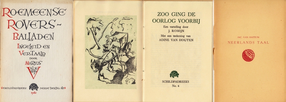 * De dichter Jaap Romijn (1912-1986), later uitgever bij Bruna en daarna directeur van museum Princessehof in Leeuwarden, was sterk actief in de ondergrondse literatuur en in het verzet. De Schildpadreeks is een serie van 27 clandestien uitgegeven, keurig verzorgde boekjes, in 1943-1944 in het geheim gedrukt onder de bezetting door de nazi’s in de Tweede Wereldoorlog, elk in een oplage van circa 100-200 exemplaren. Typografische vormgeving A.A.M. Stols, gedrukt bij de Haagse drukkerij Trio (waar Stols in die periode aan verbonden was). Er is veel poëzie bij, zowel clandestien (neutraal) als illegaal (anti-Duits).