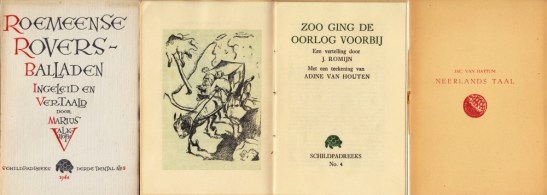 * Gesigneerd door de vertaler, die hoogleraar Romaanse talen was. Poëzie van onderdrukte Roemenen (‘haidoeks’, vogelvrije rovers die zich verzetten tegen de Turkse bezetters) uit de periode 1721-1814. Illegale uitgave, in het geheim gedrukt tijdens de nazi-bezetting. De Jong 703.