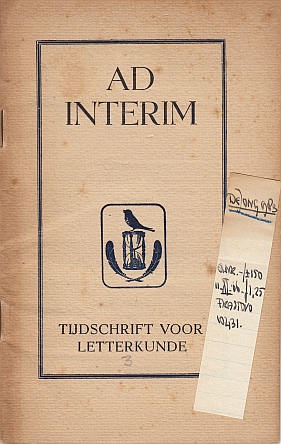 30. (ROMIJN, Jac. P., red.) Ad Interim. Tijdschrift voor letterkunde. [Onder redactie van Jaap Romijn en Gabriël Smit]. Afl. 3 (Augustus 1944). [Utrecht, eigen beheer], 1944. Geniet. 32 p. Roestvlekjes. Met het verzamelaarsbriefje van A.J. Eschauzier.