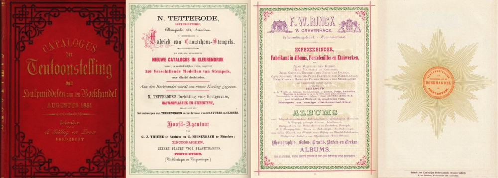 39. VEREENIGING TER BEVORDERING VAN DE BELANGEN DES BOEKHANDELS Tentoonstelling van hulpmiddelen voor den boekhandel. Augustus 1881. Amsterdam, verschillende uitgevers, 1881. Versierd linnen met goud, zwart- en blinddruk. (T. Giltay en Zoon), (4), 48, 134 p. Rijk geïllustreerd en in kleuren gedrukt door verschillende drukkers: Roeloffzen & Hübner, Gebr. Binger, Joh. Kirberger en vele andere. 1e druk. Lichte ouderdomssporen, maar in goede staat. Naam voorin geschreven. Exlibris. Met losse uitnodiging en met inliggend portret van C.L. Brinkman (1820-1881), de bekende bibliograaf, in kopergravure, afkomstig uit een ander boek.