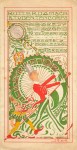 24. MENU Souper 6 Juin 1897. (Met Dansorde). Delicaat versierd en uitgestanst vouwblad, aan een kant in kleurenlithografie en reliëfdruk uitgevoerd, waarop vogeltjes elkaar ontmoeten bij een plantenbakje, aan de andere kant met het menu. 11 x 8 cm. Gedrukt in goud en pasteltinten, het menu in zwart. Enkele paraafjes in potlood. Goede conditie.