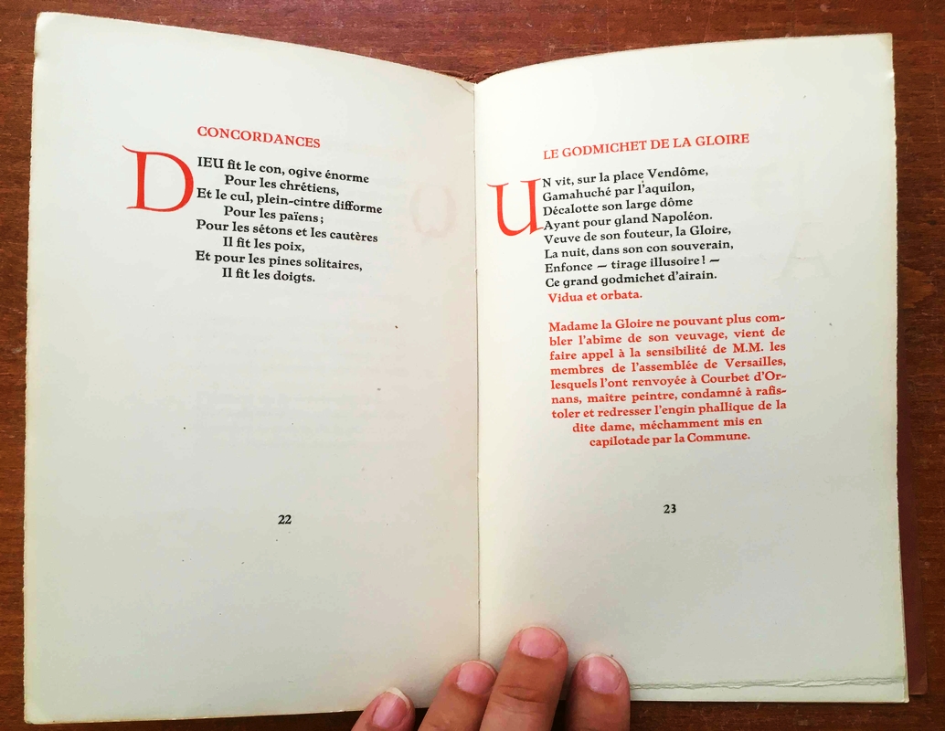 * Dit is een van 69 exemplaren op Hollands van Van Gelder. Achter de mooie suggestieve verzinsels op de titelpagina verschuilt zich de Maastrichtse drukker Charles Nypels, zoals aan de typografie heel goed te zien is. Acht erotische gedichten (lange en korte), een met muzieknoten. Dutel, Bibliographie des ouvrages érotiques publiés clandestinement en français entre 1920 et 1970 nr. 1627. Van Laar 109.