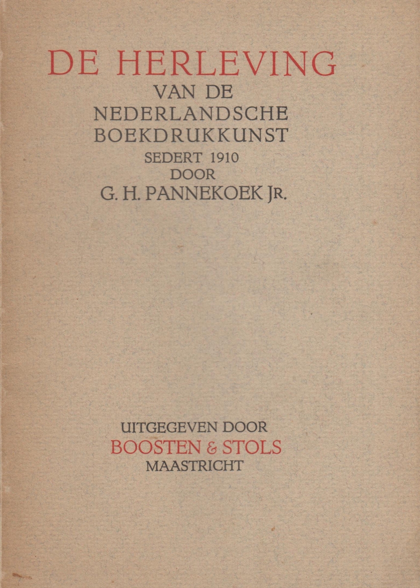 23. PANNEKOEK jr., G.H. De herleving van de Nederlandsche boekdrukkunst sedert 1910. Maastricht, Boosten & Stols, 1925. Ingenaaid. 52 p. Gezet uit de Erasmus-Mediaeval van S.H. de Roos en gedrukt in rood en zwart in 380 genummerde exemplaren. 1e druk. Omslag aan de achterkant ongelijk verbruind.