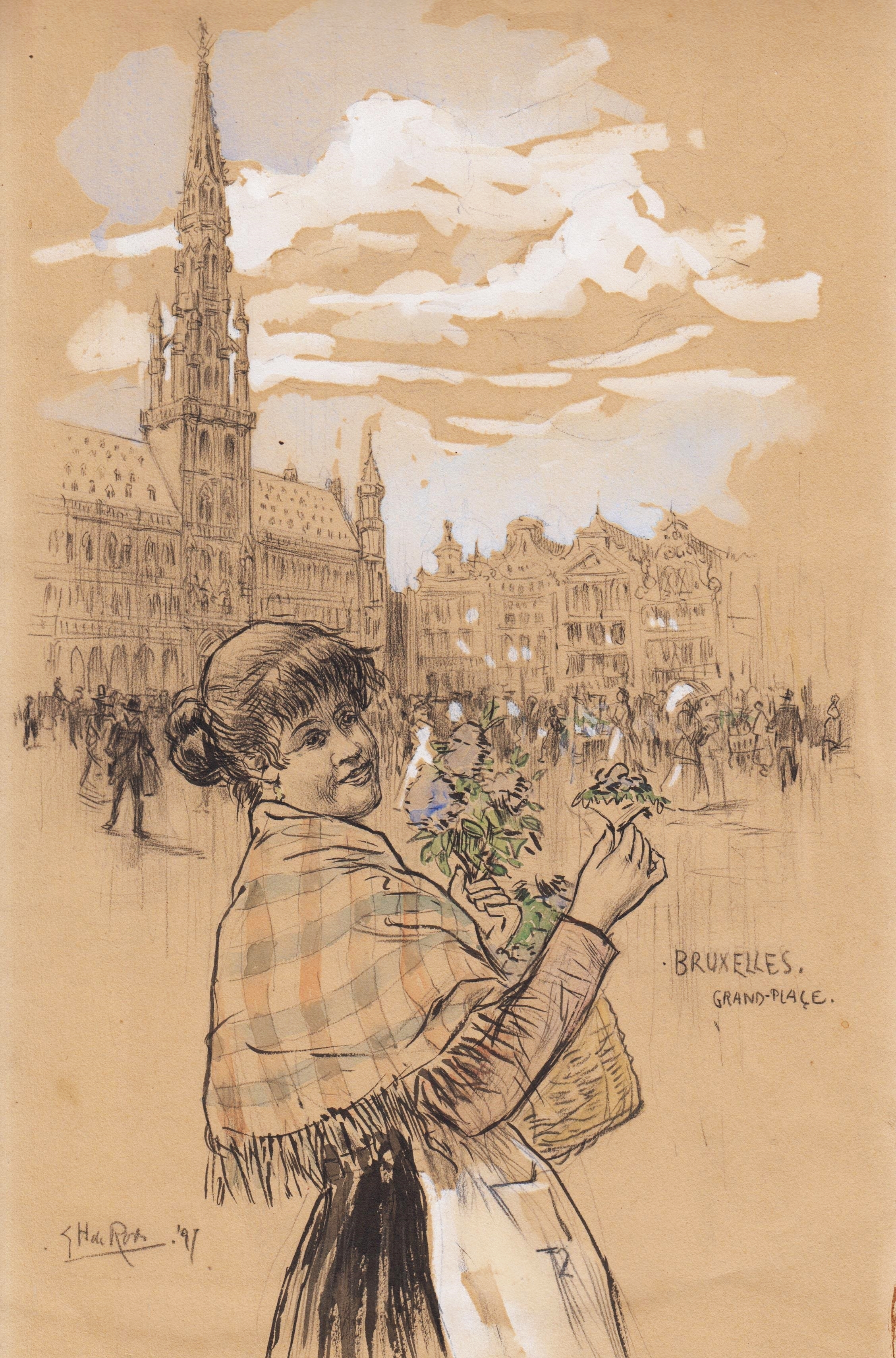 3. ROOS, S.H. de Originele tekening in potlood, Oost-Indische inkt en waterverf. (Bloemenmeisje in Brussel). 31,5 x 19,5 cm. In potlood ‘Bruxelles. Grand-Place’ en gesigneerd ‘SH de Roos. ’97’. Aan de achterkant aan de randen en hoeken verstevigd met strookjes papier.