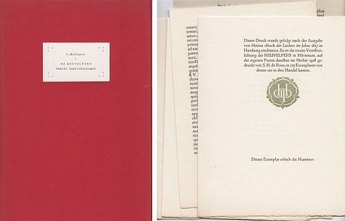 * Vierde en laatste uitgave van De Heuvelpers van S.H. de Roos op getint handgeschept Charles I-papier van Barcham Green met het watermerk van de pers – ook vanwege zijn omvang een geweldige prestatie van De Roos. C. van Dijk schrijft erover: ‘Laat men een vel “wapperen” dan hoort men een metaalachtig geluid. Zo hard als het klinkt zo lastig was het te bedrukken: de lijming was zwaar, de doorzichtigheid nogal groot.’ Daardoor werd de oplage van 125 exemplaren niet gehaald. Dit exemplaar bleef ongenummerd.