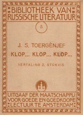 33. (ROOS, S.H. de). TOERGENJEF, J.S. Klop… klop… klop… Uit het Russisch vertaald door Z. Stokvis. Amsterdam, Maas & Van Suchtelen, 1907. Gedecoreerd linnen (met opdruk van de Maatschappij voor Goede en Goedkoope Lectuur, ontwerp S.H. de Roos). 228 p. 1e druk. Exlibris en merkje van boekhandel Dixon in Deventer. Keurig.