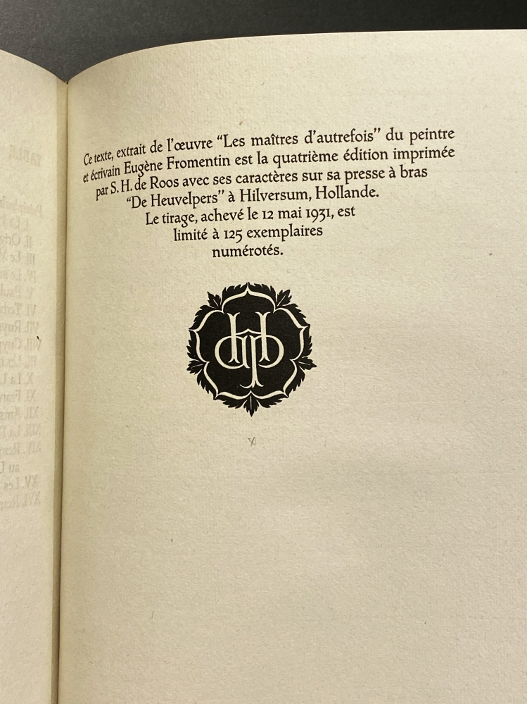 17. (HEUVELPERS, De). FROMENTIN, Eugène Les maîtres d’autrefois. Hollande. Hilversum, De Heuvelpers, 1931. 28,3 x 19,8 cm. Ingenaaid met omslag en titeletiket. In kartonnen foedraal. (6), VIII, 158 p. Gezet uit de (door de drukker zelf ontworpen) Meidoorn-letter en gedrukt op de handpers op papier met watermerk H-P in een oplage van 125 genummerde exemplaren.
