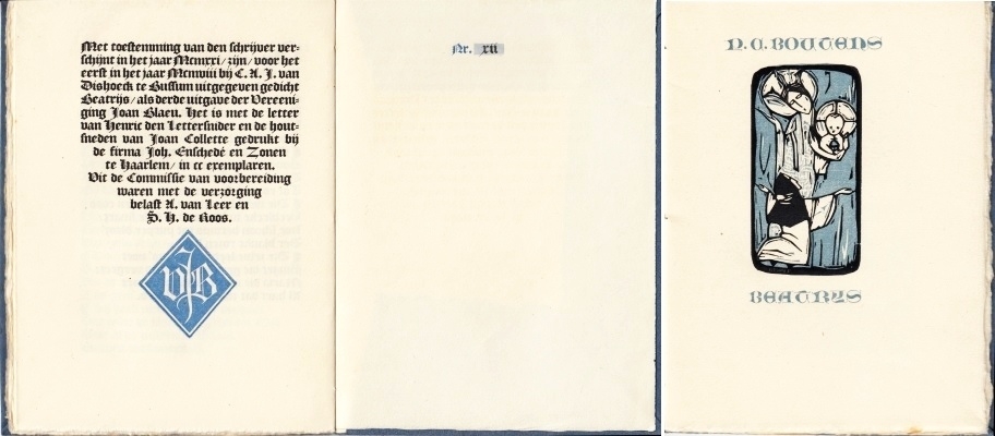 5. BOUTENS, P.C. Beatrijs. (Met vijf originele houtsneden van Joan Collette). [Amsterdam], (Vereeniging Joan Blaeu, 1921). Ingenaaid met omslag. (28) p. Gezet uit de letter van Henric de Lettersnider en gedrukt door Joh. Enschedé in blauw en zwart in een oplage van 200 genummerde exemplaren. Boekverzorging van A. van Leer en S.H. de Roos. Vlekje achterop, verder een mooi exemplaar.