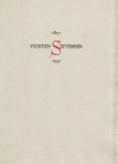 26. ROOS, S.H. de 1877 Veertien September 1942. (Amsterdam, Duwaer), oktober 1942. Tweemaal gevouwen blad grijs geschept papier met watermerk Meidoorn. Gezet uit de Meidoorn en twee initialen en gedrukt in rood en zwart. 1e druk. Papierfout buiten de tekst.