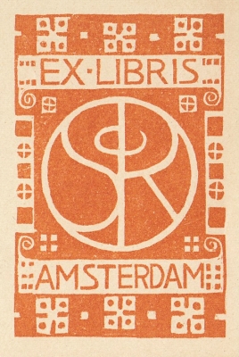 1. ROOS, S.H. de Exlibris. 6,5 x 4,5 cm (bladformaat). Gedrukt in oranje met tekst ‘Ex-Libris/ Amsterdam’ en monogram ‘SdeR’. Zeer gaaf.