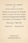 25. ROOS, Familie De Trouwkaart van Hendrik Jan Lebbink en Janna Saskia de Roos, Hilversum, 3 Mei 1933. 17,5 x 11,5 cm. Kaart van geschept papier. Gezet uit de Erasmus.
