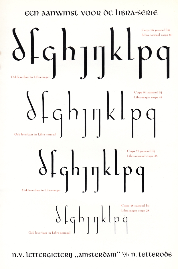 19. LETTERPROEF LIBRA Libra. In: Grafische mededeelingen. 1e jaargang no. 9, februari 1940. Amsterdam, N.V. Lettergieterij “Amsterdam” v/h N. Tetterode, 1940. Geniet. 16 p. Geïllustreerd. 1e druk. Rugje iets ingescheurd, zijrand wat stoffig, maar in uitstekende staat.