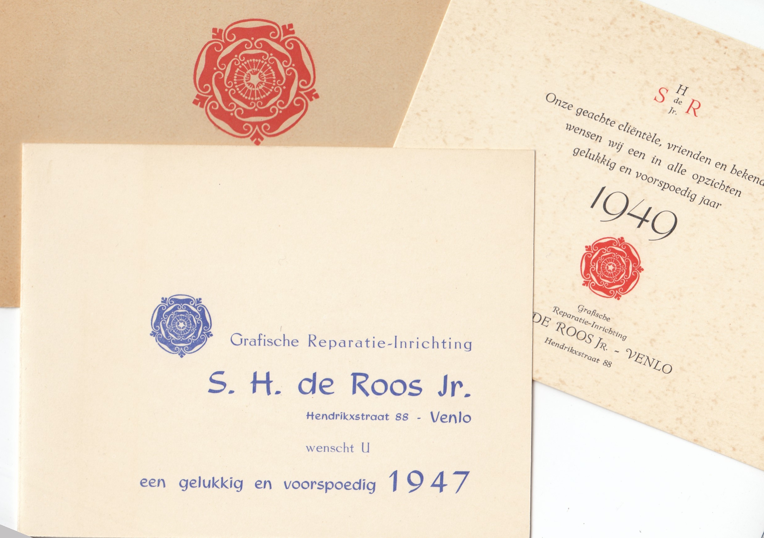 24. ROOS Jr., S.H. de Reclamekaarten voor de Grafische Reparatie-Inrichting S.H. de Roos jr. te Venlo. Drie oblong-kaarten uit 1946-1949, twee gedrukt in rood en zwart, een in blauw. Uitstekende staat.