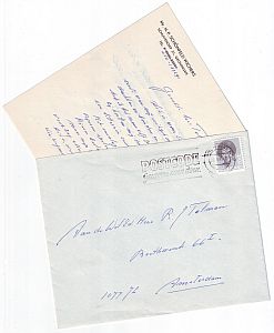 * Interessante en belangwekkende brief over het in eigen beheer uitgegeven debuut, De Verhalen van Belcampo (1934). De schrijver meldt dat Tolman een ‘buitenkansje’ heeft, want het is ‘het eerste van mij uitgekomen boek en wel dat ik op eigen kosten heb laten drukken en binden in 500 exemplaren […] Zij kostten mij toen f 0,40 per stuk en ik verkocht ze voor f 2. Nu is het een litterair curiosum en worden er honderden voor betaald’. Belcampo verklapt dat de bandtekening ‘eigen ontwerp’ is.