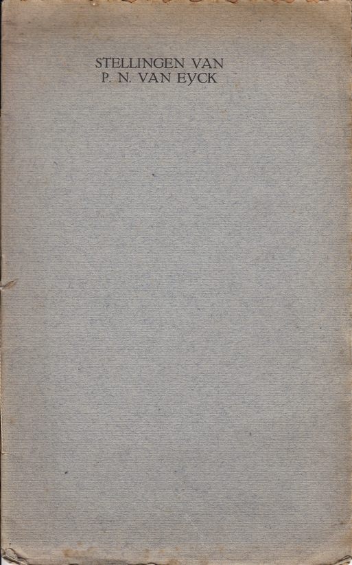 27. EYCK, P.N. van – (BLOEM, J.C.). Stellingen ter verkrijging van den graad van Doctor in de Rechtswetenschap aan de rijksuniversiteit te Leiden […] op Donderdag 23 April 1914 […]. Den Haag, eigen beheer, 1914. 26 x 16 cm. Grijs omslag, cahiersteek. 8 p. Gezet uit de letter Tiemann en gedrukt op geschept papier door Electr. Drukkerij De Atlas in zeer geringe oplage. 1e druk. Wat roest.
