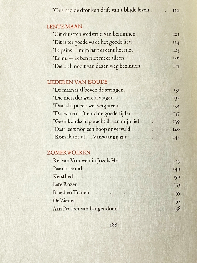 15. BOUTENS, P.C. Gedichten van P.C. Boutens gekozen uit zijn lyrische werk van 1894-1929 (door J.W.F. Werumeus Buning die ook het voorwoord schreef). Haarlem, Enschedé, 1930. Linnen. Kop verguld. (6), 206 p. Gedrukt door Enschedé in rood en zwart in een oplage van 160 exemplaren. Band wat dof, rug onderaan ingedeukt. Stempel onderaan de franse titel (‘Warmond/ Hache..’).