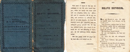 1. ANSLIJN Nz., Nicolaas De Brave Hendrik, een leesboekje voor jonge kinderen. Leiden, D. du Mortier en Zoon, 1841. Cahiersteek met bedrukt blauw omslag. 32 p. 16e druk. Wat versleten aan de randen: goed gebruikt, maar nog in heel behoorlijke staat.