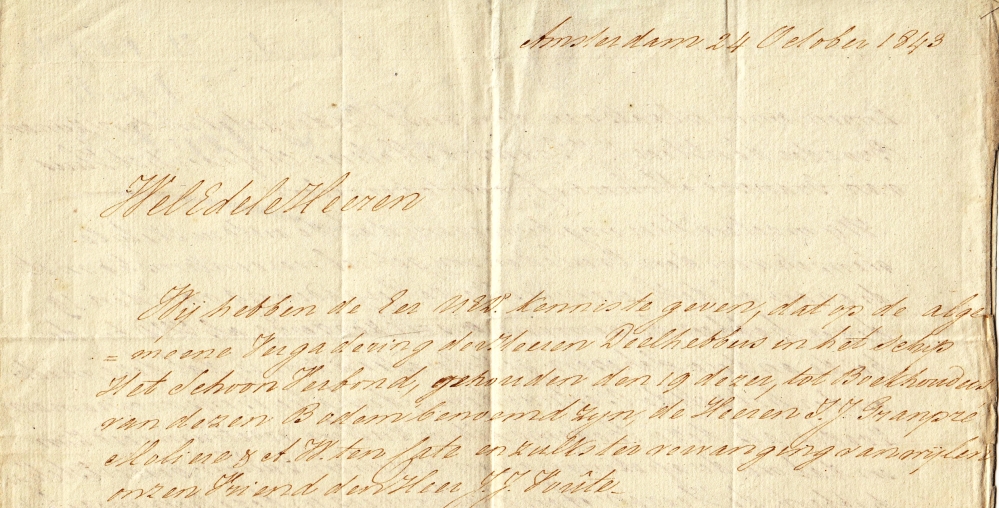 40. VOÛTE, Erven J.J. Handgeschreven brief van I.J. Granpré Molière, J.M. Reynvaan en H.P. Witkamp aan ‘de Heeren Ketwich & Voombergh, Alhier’, gedateerd ‘Amsterdam 24 October 1843’. Gevouwen blad geschept papier, watermerk Holland met schelp, aan drie kanten beschreven en tot postblad gevouwen. 40 r. Bruine inkt. Enkele randbeschadigingen. Vrij goed leesbaar.