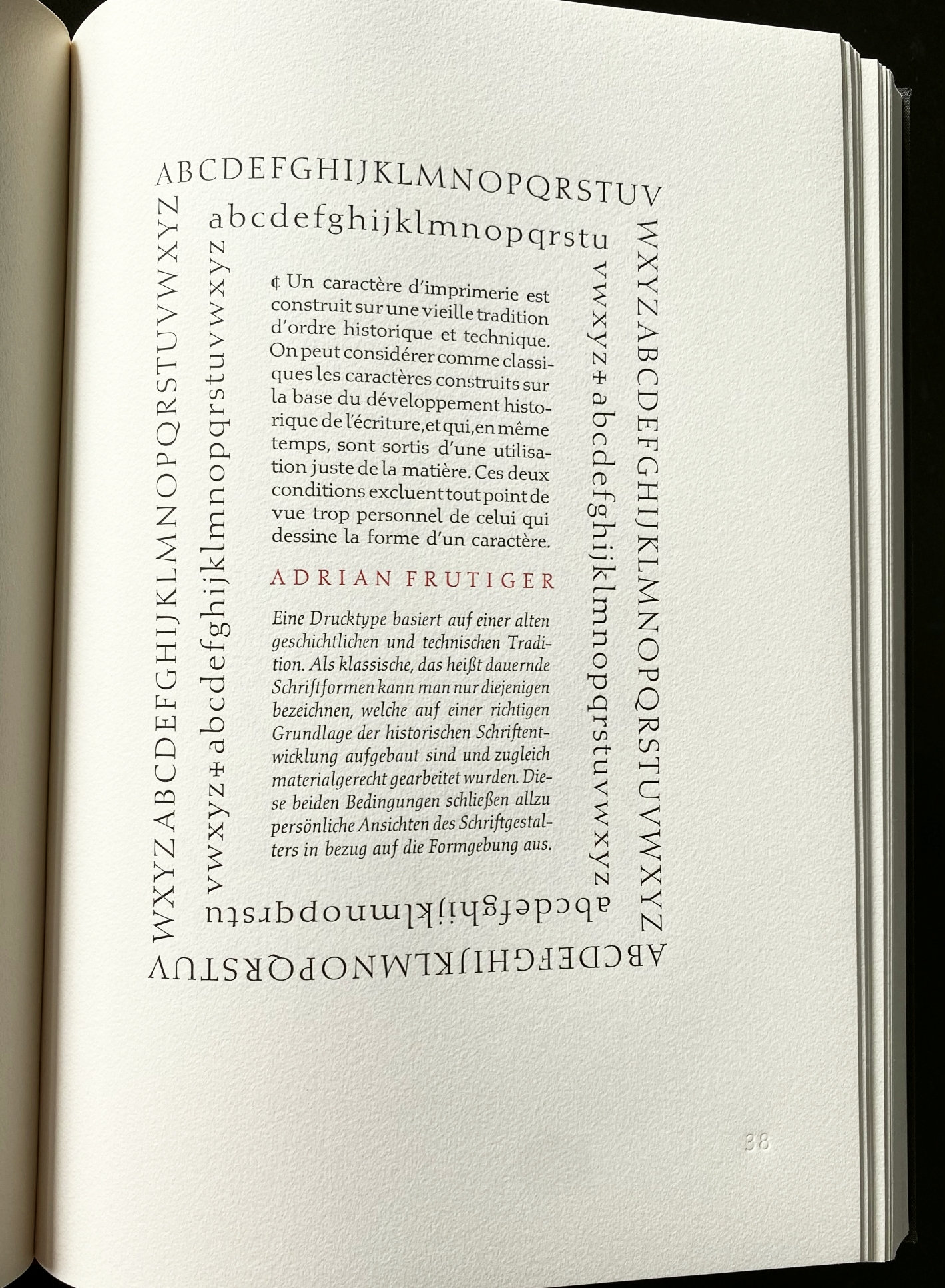 Bijzonder bewerkelijk: elke pagina gevat in een barokke sierrand, met ettelijke uitklappagina’s (onder andere de titel), de letterproeven tot de rand gevuld met ouderwetse schreefletters: een fantastisch en vermakelijk boek, het bizarre credo van een Britse excentriek – redacteur van een communistisch tijdschrift, van faillissement gered door een Amerikaanse vrouwelijke miljonair, met een barok-renaissancistische smaak qua typografie, gekenmerkt door fleurons en decoratieve kaders. Francis Meynell (1891-1975) stichtte in 1922 de succesvolle Nonesuch Press, waarin we de in dit boek geschetste typografische beginselen toegepast zien.
