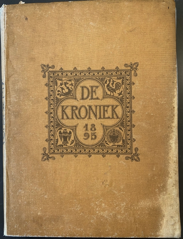 . HOYTEMA, Theo van, – Antoon MOLKENBOER, Marius BAUER, Jan VETH, e.v.a. De Kroniek. Een algemeen weekblad. Onder redactie van P.L. TAK. Jaargang 1, 1895. Afl. 1-53 (53 nummers van elk 8 pag., complete jaargang). 40 x 32 cm. Originele gedecoreerde linnen band. 1e druk. Zonder de omslagen (zoals gewoonlijk), maar met de bijlagen, de meeste ongevouwen. Band schraal en met tropenschade. Boekblok ligt los. Sommige bladen aan de randen wat versleten (o.a. de Toorop-litho). De prenten zijn recent voorzien van beschermende bladen vloeipapier.