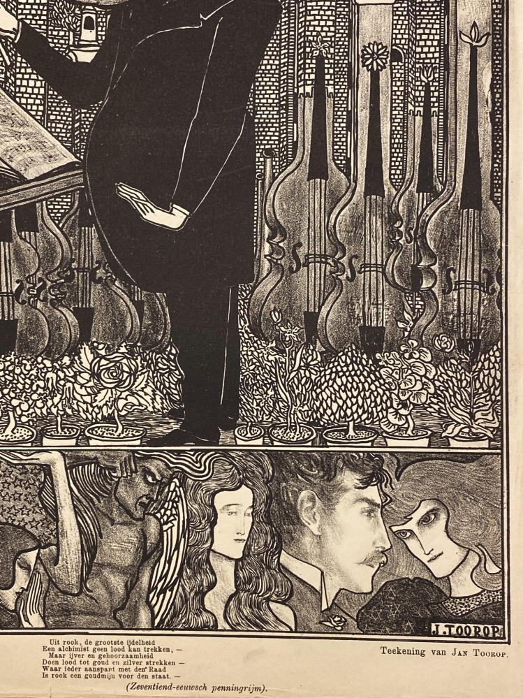 En het meest opmerkelijk: de 53 bijlagen, meest platen in lithografie (één in duplo: een politieke litho van Marius Bauer over twee pagina’s): een twintigtal politieke tekeningen van Antoon Molkenboer en een dertiental van Marius Bauer (pseudoniem Rusticus). Twee kleurenlitho’s van Van Hoytema, o.m. de beroemde affiche van De Kroniek, een litho naar Vincent van Gogh (‘De spitter’), drie van Willem van Konijnenburg, drie van H.J. Haverman, 6 van Jan Veth (vijf prachtige portretten, een van H.W. Mesdag in oranje afgedrukt, en van o.a. A.F. de Savornin Lohman en C. Winkler), een curieuze politieke prent van Jan Toorop – plus een muziekblad van Alphons Diepenbrock op tekst van Laforgue. Veel Kroniek-jaargangen zijn uit elkaar gehaald om de prenten los te verkopen, maar de tekst van het tijdschrift biedt evengoed een fascinerend tijdsbeeld in woord en beeld!