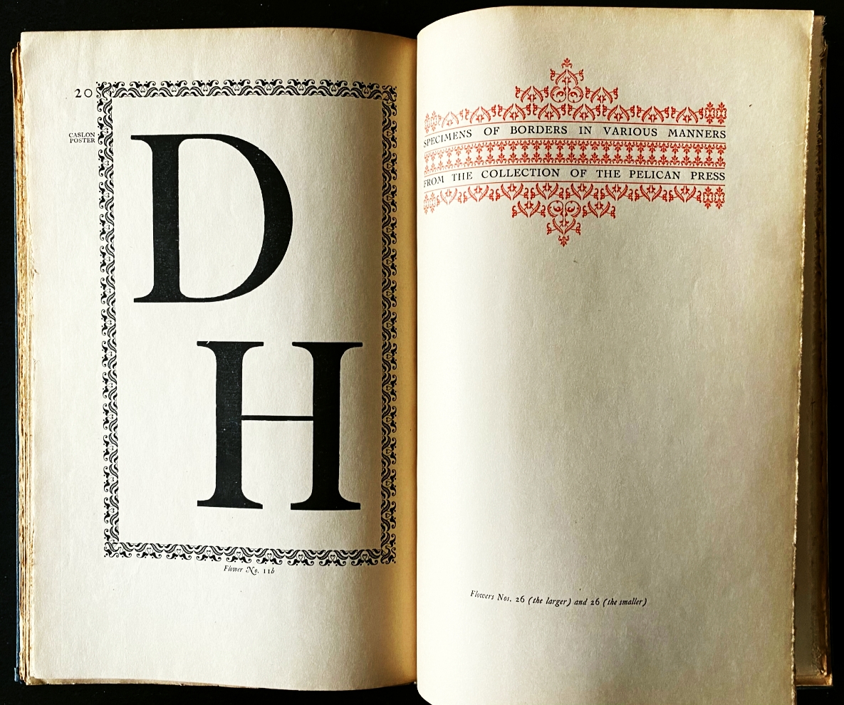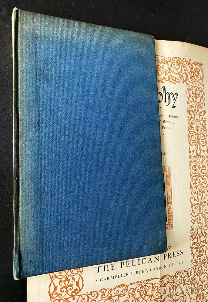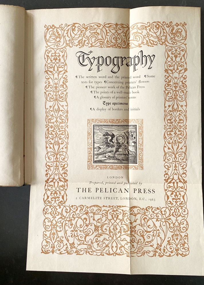 32. MEYNELL, Francis Typography ¶ The written word and the printed word ¶ Some tests for types ¶ Concerning printers’ flowers ¶ The pioneer work of the Pelican Press ¶ The points of a well-made book ¶ A glossary of printers’ terms. Type specimens ¶ A display of borders and initials Londen, The Pelican Press, 1923. 26 x 17 cm. Karton. (4), (46 p.), (30 eenzijdig bedrukte bladen), 6 p. Verschillende uitklappagina’s en een ingeplakte afbeelding. Gedrukt met verschillende kleuren. 1e druk. Rug flink gevlekt, titeletiket ongaaf, band wat verbleekt en gevlekt; het blauw is iets uitgelopen over de voet van de voorste schutbladen. Met exlibris van Huibrecht van Krimpen.