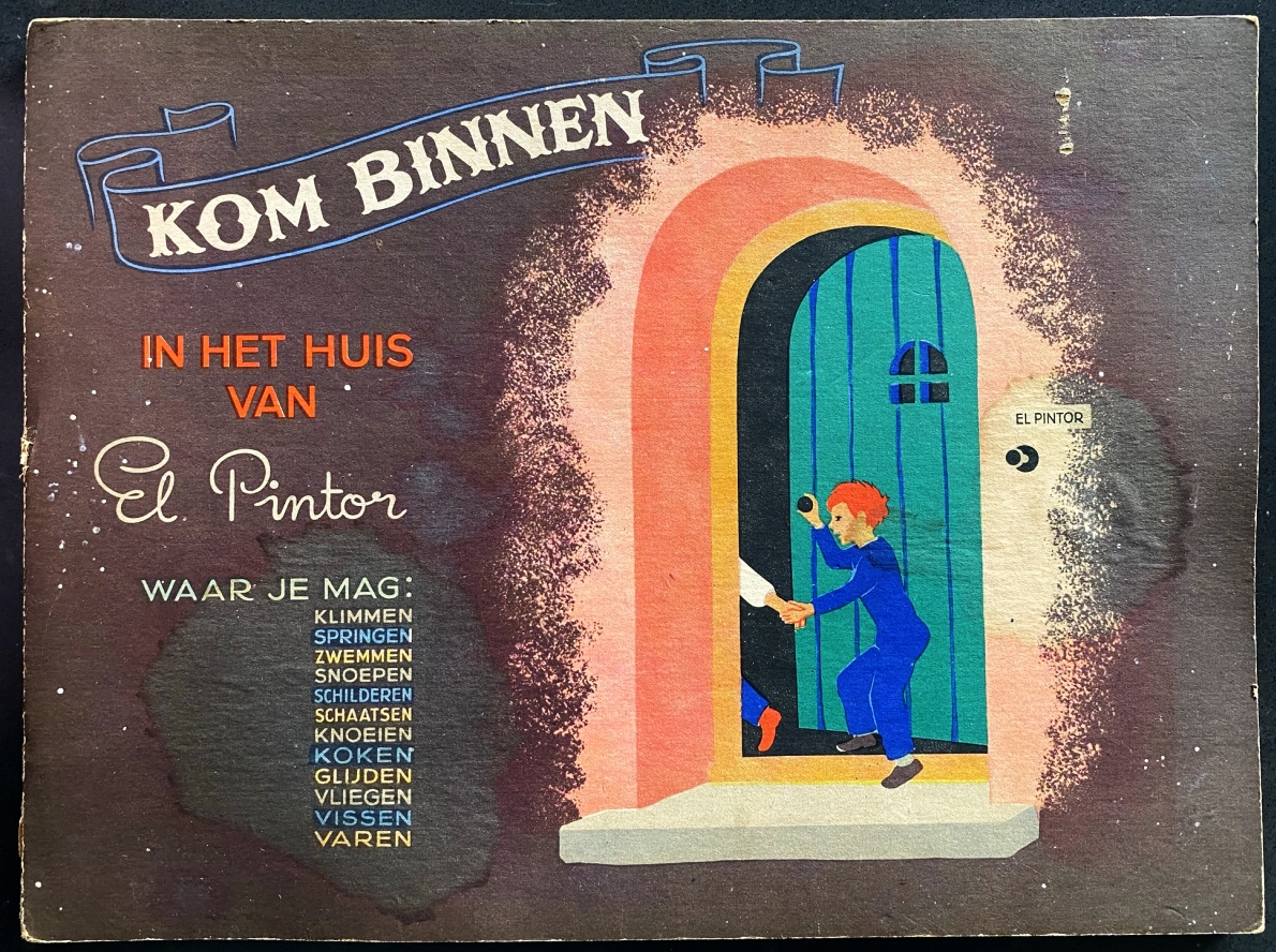 26. EL PINTOR Kom binnen in het huis van El Pintor waar je mag: klimmen springen zwemmen snoepen schilderen schaatsen knoeien koken glijden vliegen vissen varen. Amsterdam, Variété, [1943]. 27 x 19 cm. Toyland-serie. Karton. 8 bladen incl. omslag. 1e druk. Voorkant gevlekt en met een krabspoor