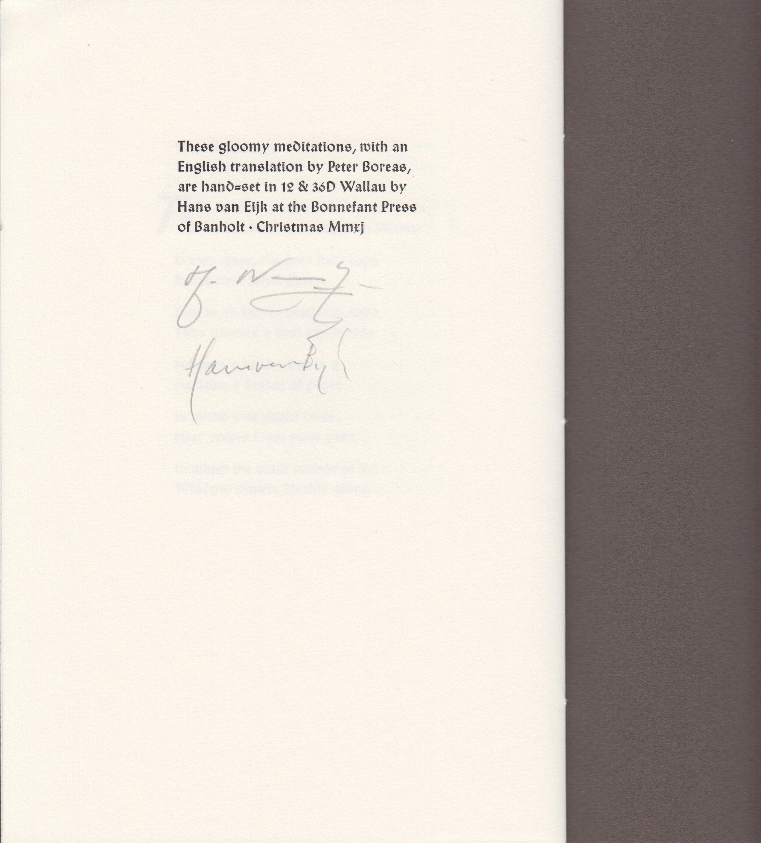 * Tweetalige uitgave: de drie gedichten zijn ook vertaald naar het Engels door Peter Boreas. Gesigneerd door auteur en drukker onder het colofon. Intrigerend lettertype van Rudolf Koch.