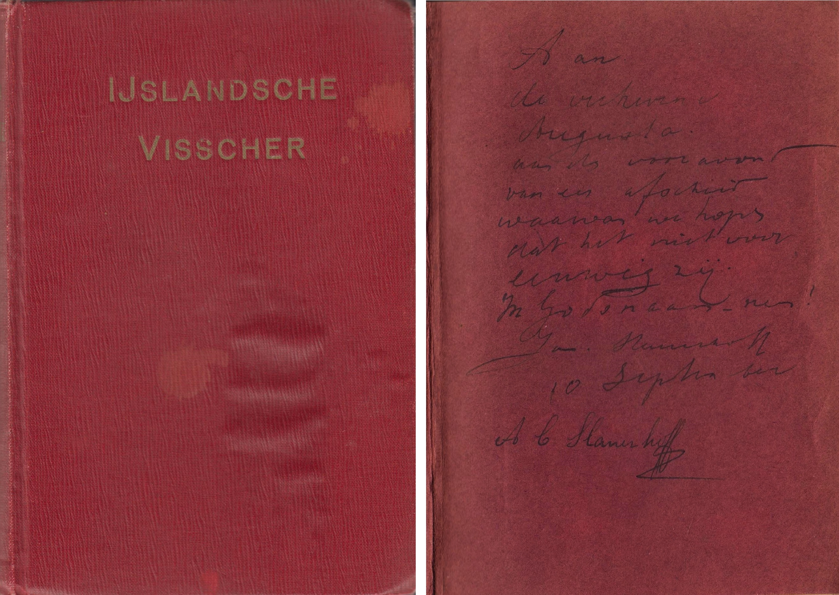 39. (SLAUERHOFF, J.). LOTI, Pierre IJslandsche visscher. Vertaald door Th.A. Quanjer. Rijswijk (Z.-H.), Blankwaardt & Schoonhoven, [1916]. Linnen. 228 p. 1e druk. Rug deels ingescheurd. Vochtvlek op voorplat. Schuingelezen. Naam ‘A C Slauerhoff’ op schutblad.