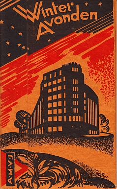 1. A.M.V.J. Winter-Avonden. Amsterdam, Amsterdamsche Maatschappij voor Jongemannen, (ca. 1930). Leporello-omslag van 12 p. oranje papier, met ingeniet boekje van 16 p. Met 6 illustraties op het omslag. Tekst gelardeerd met geïllustreerde advertenties. Mooi exemplaar.