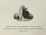 5. (CLAUS, Hugo). MANZONI, Alessandro I Promessi Sposi (The Betrothed). The 1844 translation revised and with an Introduction by Ronald H. Boothroyd. Illustrated with the designs of Francesco Gonin engraved for this edition by Bruno Bramanti. Verona, Printed for the Members of The Limited Editions Club at the Officina Bodoni, 1951. 27 x 18 cm. Grof halflinnen met gedecoreerde platten. XII, 682 p. Niet afgesneden. Met houtgravures naar de illustraties van 1844, voor deze editie gegraveerde door Bruno Bramanti. Gedrukt in 1500 genummerde exemplaren, alle gesigneerd door drukker Giovanni Mardersteig en kunstenaar Bramanti. Rug iets verkleurd.