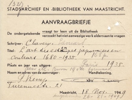 * Voorgedrukt formulier, door Kemp ingevuld met inkt en potlood en met een enkele potloodaantekening van een ambtenaar. Kemp vroeg ter leen het boek ‘L’art des estampes japonaises en couleurs 1680-1935′ door Edouard Clavery. Op de daarvoor bestemde plaatsen schreef hij ook zijn naam, adres, handtekening en datum (’18 Nov. 49’). Leuk curiosum!