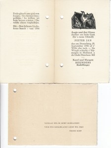 2. Geboortekaartje van Pieter Jan Reijnders, geboren op 25 september 1952. Vouwkaart. 13,9 x 9,1 cm (in gevouwen toestand). Gedrukt in donkergrijs. Met op de voorzijde een door Maurice Laudy ontworpen monogram, op pagina (2) staat een fragment uit ‘Een Schoon Liedekens-boek’ uit 1544, op pagina (3) de geboorteaankodiging (in het Duits) met een illustratie. Perforatiegaatjes links.