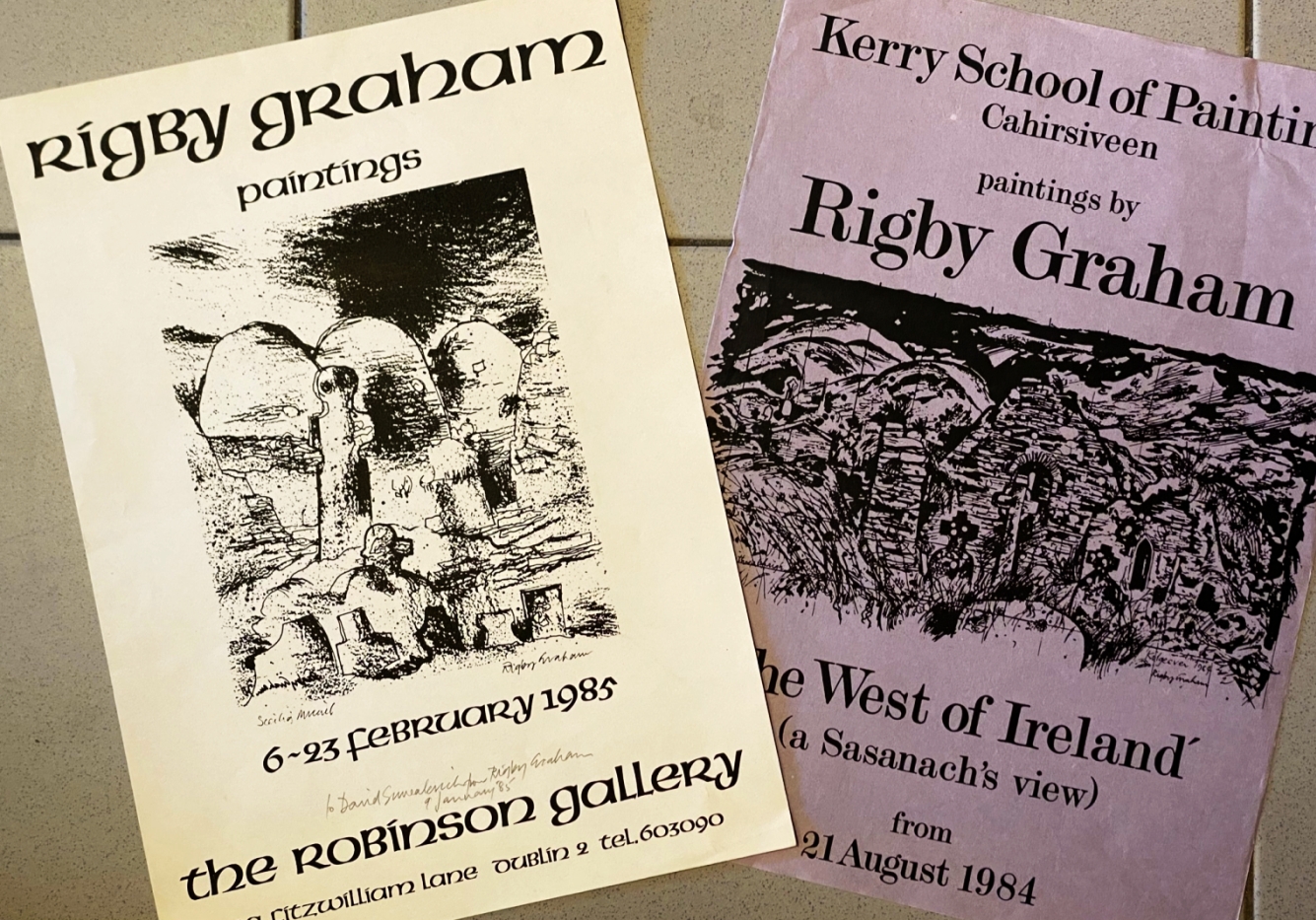 * Eén met handgeschreven opdracht van Graham aan David Simaleavich, gedateerd ‘9 January ’85’. In dat jaar organiseerde David een tentoonstelling van Rigby Graham in zijn Binderij Phoenix (affiche ook in deze collectie). Rigby Graham (1931-2015) was een landschapsschilder en -tekenaar met een romantische, dramatische inslag, zijn karakter even hoekig en compromisloos als de landschappen op deze affiches.