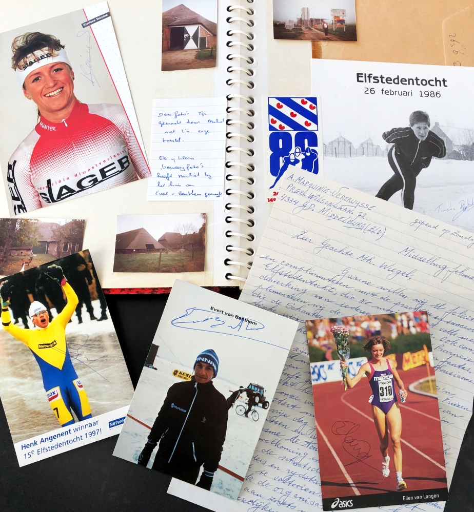10. ELFSTEDENTOCHT-ALBUM Album van een verzamelaar van handtekeningen. Bevat gesigneerde ansichtkaarten van Henk Angenent, Evert van Benthem (2 stuks: éen uit 1985, met wat aardige woorden van de vrouw van Van Benthem, en éen uit 1986, waarop de handtekening overduidelijk door iemand anders is gezet), Tineke Dijkshoorn, Klasina Seinstra, + brief en kaart zonder foto van Lenie van der Hoorn (2). Ook met concepten van brieven aan Hans Wiegel (de Friese commissaris van de Koningin ten tijde van de Elfstedentochten 1985 en 1986), enkele krantenknipsels en een paar originele foto’s van de boerderij van Evert van Benthem.