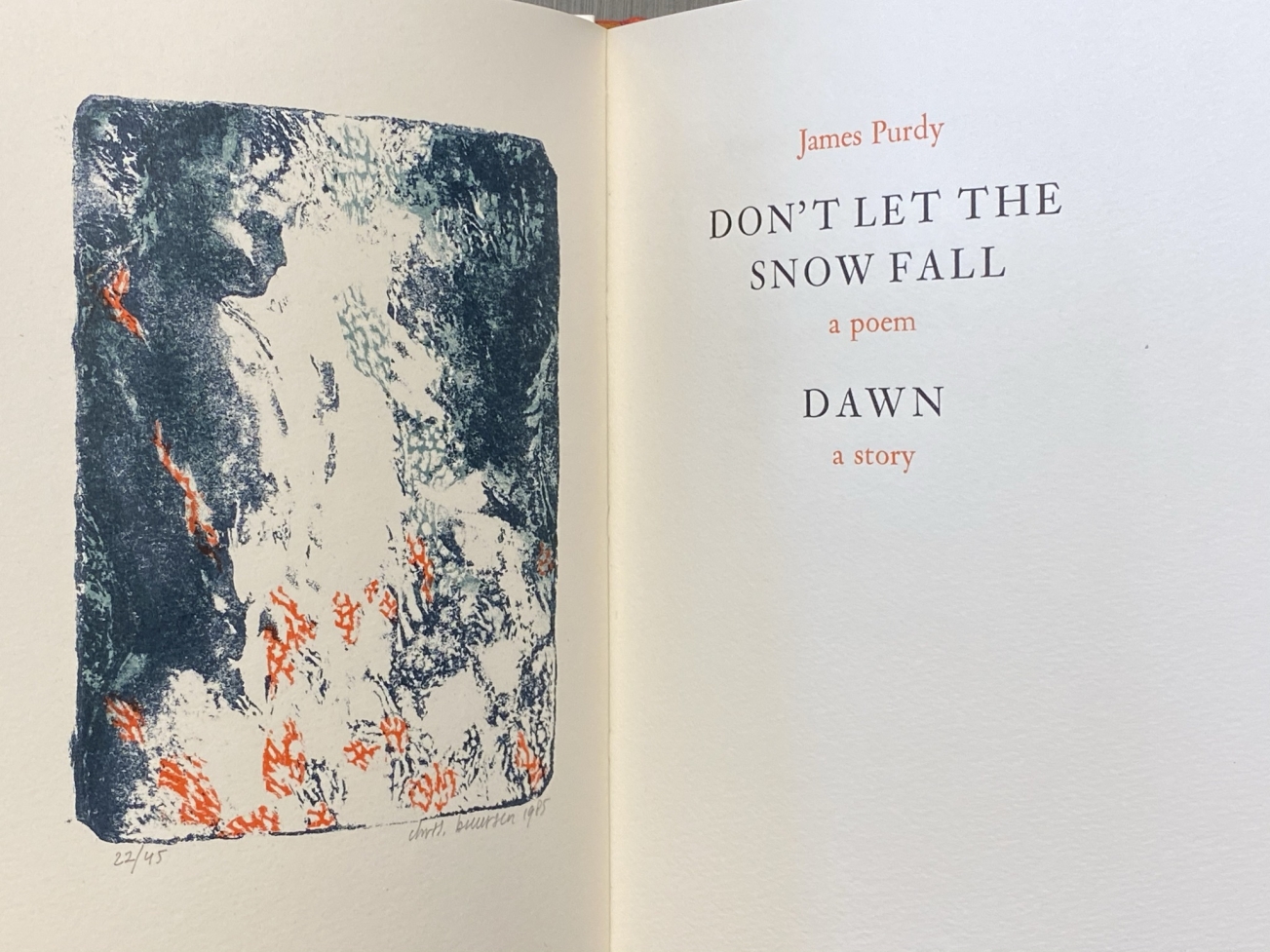 31. PURDY, James Don’t let the Snow fall. A poem. Dawn. A story. (Bijzonder exemplaar met een portret van Purdy in kleurenets). (Sub Signo Libelli), [1985]. Verguld oranjerood halfmarokijn (Binderij Phoenix). (4), 20 p. Met twee originele, genummerde en gesigneerde kleurenlitho’s door Chris Buursen. Met de hand gezet uit de Monotype Van Dijck en gedrukt in rood en zwart op zwaar velijn in een oplage van 95 genummerde exemplaren. 1e druk.