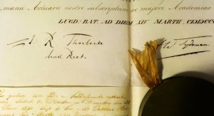 43. (THORBECKE, Johan Rudolph). MIERLO, J.H. van Doctorsbul op perkament, gedateerd 14 Maart 1840, voor Jacobus Hermanus van Mierlo (1816-1905), gesigneerd door Johan Rudolph Thorbecke en anderen. Doctorsbul van de jurist Jacobus Hermanus van Mierlo (1816-1905), ondertekend door Thorbecke en andere academische hoogwaardigheidsbekleders. Perkament met aanhangend (gebroken) lakzegel in koperen doos. Oblong 32 x 50 cm. Eenzijdig beschreven. Gevouwen.