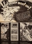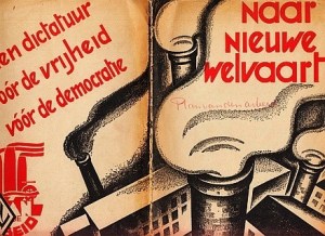 * ‘De loods [van het schip op weg naar Welvaart]: “Je koers is fout. Het roer moet om!”‘ Die nieuwe koers is het socialistische, internationale Plan van de Arbeid. Veel over het fascisme en het communisme. ‘Kiezen tussen fascisme en communisme betekent: kiezen tussen de dood door de valbijl of de dood door de kogel’. Over Mussert, bij een portret van Goering: ‘de humbug, de opschroeverij, de snorkerigheid en protserigheid van fascistische reclame’. Ook met een uitgebreid artikel over de methoden van de Gestapo en een karikatuur van Goebbels.