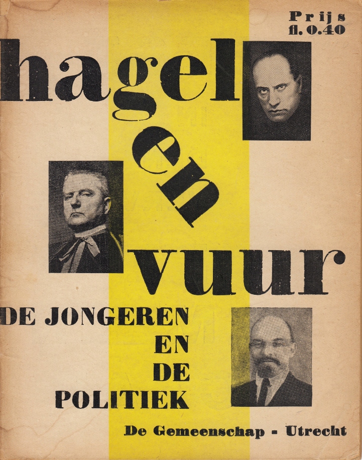 * Fel politiek pamflet, opgebouwd uit allerlei teksten (Nieuwenhuis, Knuvelder, Kuyle) en bellettrie van Wichman (‘…Aan schimmeldraad en spinrag hangt gij boven d’afgrond…’), Van Duinkerken, Wijdeveld en Marsman (‘liever onkruid dan klimplant. Vooruit!’). (Moderne parallellen niet uitgesloten). Overwegend afkomstig uit de polemische rubriek ”Hagel” van het tijdschrift De Gemeenschap, en veelal gericht tegen de Roomsch-Katholieke Staatspartij van monseigneur Nolens. Expressieve typografie. Voorop portretjes van Mussolini, Nolens en Lenin (met respectievelijk een gemene, een hooghartige en een satanisch grijnzende blik).