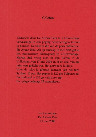 12. HIRSI ALI, Ayaan Genesis. (Den Haag, Althaea Pers, 2006). Cahiersteek met aangenaaid titelblad. (4) p. Gedrukt op 120 grams Tulpenrood in een oplage van slechts 25 exemplaren.