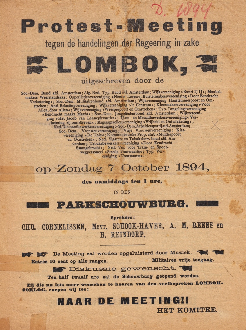 * Oproep tot een protestvergadering van de Sociaal-democratische Bond van Domela Nieuwenhuis op 7 oktober 1894 in de Parkschouwburg tegen de Tweede Lombok-expeditie, een Nederlandse koloniale strafexpeditie op het eiland Lombok (2 september-24 december 1894). Met op de achterkant een felle verklaring: het ‘regeeringsbeleid in al onze [overzeese] bezittingen berust op niets anders dan op bedrog en list, diefstal en uitzuigerij’. Fraai en zeldzaam overblijfsel van levendige strijd tegen oud onrecht.