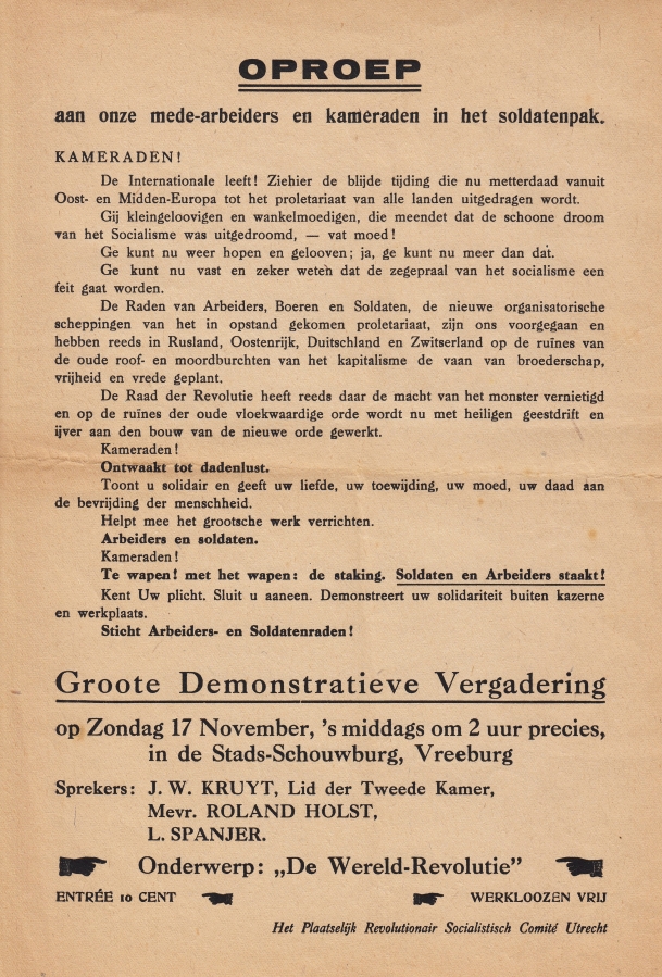31. (ROLAND HOLST, Henriëtte) Oproep aan onze mede-arbeiders en kameraden in het soldatenpak. (Affiche). Utrecht, Plaatselijk Revolutionair Socialistisch Comité, [1918]. 30 x 22 cm. Eenzijdig gedrukt op krantenpapier. Wat vouwtjes, in goede conditie.