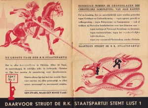* Dramatisch, zeer uitgewerkt getekend pamflet voor de Tweede Kamerverkiezingen van 1946, de eerste van na de oorlog. ‘Strijdt gij mede voor een gezond gezin, een krachtig volk’. Achterop de eerste zes kandidaten, met op 1. pater Stokman en op 2. C.P.M. Romme. Helaas is de tekenaar onbekend.