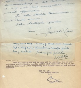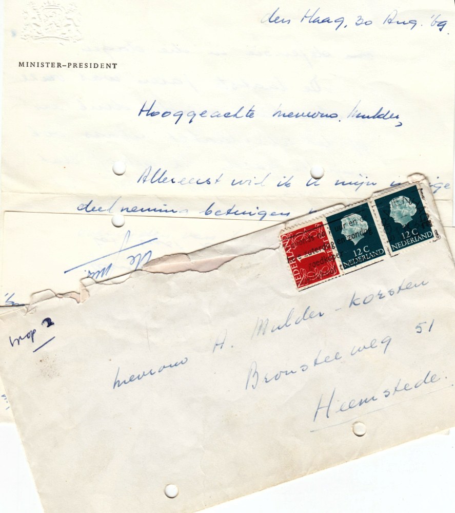 De Jong (minister van Defensie van 1963-1967, minister-president van 1967-1971) excuseert zich voor de begrafenis, want hij ligt ziek in bed. ‘Uw broer en ik hadden een goede en prettige samenwerking enkele jaren geleden op Defensie.’ ‘Hij heeft een groot aandeel gehad in het weer tot rust komen van de sfeer om defensie in die dagen.’ Openhartige brief over een saillante, ongekozen politieke figuur van de populaire minister-president, die tot het eind van zijn lange leven (1915-2016) een invloedrijke figuur bleef in het CDA.