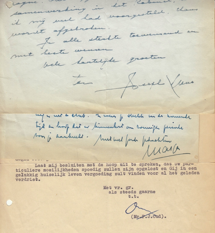 25. OUD, P.J., & Jacques DUTILH Drie handgeschreven/ getypte brieven aan het Rotterdamse VVD-gemeenteraadslid D.A. van Houte. Brief op eigen postpapier alsmede een briefkaart van P.J. Oud, gedateerd 12/1 ’55 en 2/9 ’57. Beide handgeschreven, 8 regels, gesigneerd. Over deelname van Van Houte aan de Commissie Volksgezondheid en goede wensen voor een verblijf in het buitenland. Brief op eigen papier van Jacques Dutilh, 5 r. getypt en twee geschreven, gedateerd 6 sept. 1957. Dank voor de orchidee die Dutilh had gekregen voor zijn 30-jarig lidmaatschap van de gemeenteraad van Rotterdam. In keurige staat. Bijgevoegd het boek Mr. P.J. Oud gezien door zijn tijdgenoten (1951) met handtekening van Oud.