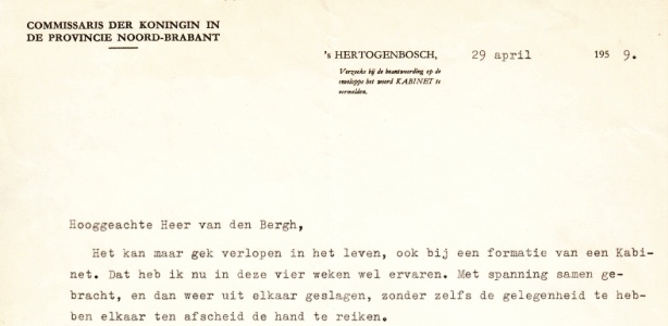 * De psycholoog J.E. de Quay (1901-1985) was in de oorlog een omstreden politicus geweest, maar in 1946 werd hij, gezuiverd van blaam, commissaris van de Koningin in Brabant. Toen de KVP in 1959 de grootste partij werd, kreeg hij het verzoek minister-president te worden. Hij werd beëdigd op 19 mei 1959. Deze brief dateert uit de voorbereidingstijd van het kabinet: ‘Met spanning samen gebracht, en dan weer uit elkaar geslagen, zonder zelfs de gelegenheid te hebben elkaar ten afscheid de hand te reiken.’ Kennelijk was de formatie mislukt; ook de ondertekening duidt niet op succes: ‘In de hoop, dat het goede vaderland op een andere wijze uit de moeilijkheden wordt geholpen, in de hoop ook U zo nu en dan eens weer te zien, verblijf ik met vriendelijke groet en hoogachting,/ J. de Quay.’ Drie weken later trad het kabinet-De Quay aan, met Sidney van den Bergh als minister van Defensie.