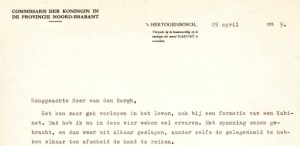3. (BERGH, Sidney van der). Jan de QUAY Getypte brief aan aspirant-minister Sidney van den Bergh. Op papier bedrukt met ‘Commissaris der Koningin in de Provincie Noord-Brabant’. 29,0 x 21,0 cm. 13 regels. Gericht aan ‘Hooggeachte Heer van den Bergh’, gedateerd ”s Hertogenbosch, 29 april 1959”. Tweemaal gevouwen.