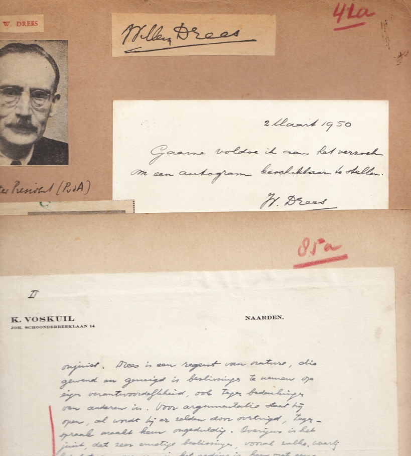 8. DREES, W. Handgeschreven kaartje van Willem Drees met een karakteristiek van Drees door Klaas Voskuil. Dossiertje uit de collectie van de grafologisch geïnteresseerde handschriftenverzamelaar Petrus Mulder (1902-1967). Kaartje met de mededeling ‘2 Maart 1950/ Gaarne voldoe ik aan het verzoek om een autogram beschikbaar te stellen. W. Drees’. Opgeplakt op een blad karton. Bijgevoegd, uit dezelfde collectie: een blad uit een brief van Klaas Voskuil (de vader van J.J. Voskuil), die van 1945-1961 hoofdredacteur was van het socialistische dagblad Het Vrije Volk: 26 regels, gesigneerd. Eveneens op karton geplakt. Op deze bladen zijn enige ongerelateerde schrijfproeven geplakt, deels gedrukt. Ook met aantekeningen van Mulder.