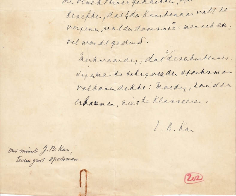 46. VOETBAL – J.B. KAN ‘Wie Schröder den eersten sportjournalist zou noemen, stelt zich onder verdenking hem aanprijzend te kleineeren’. Handschrift van oud-minister J.B. Kan over sportjournalist en voetballer J.C. “Kick” Schröder (1871-1938). Eén blad, tweezijdig in pen beschreven en gesigneerd ‘J.B. Kan’. 32,5 x 20,1 cm. 44 regels. Papercliproest en notitie van de hand van Petrus Mulder, de grafologieverzamelaar: ‘oud minister J.B. Kan, tevens groot sportsman.”