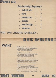 * Wenst gij een krachtige/ beleidvolle/ fiere/ waakzame/ zuinige/ verstandige/ nationale Regering? Stem dan Rechts Katholiek, dus Welter! Gevolgd door een heus Verkiezingssonnet (nee, met een kwatrijn teveel, dank voor je opmerkzaamheid, Dick Welsink!), gedicht door zekere ‘B.’. En dat is niet het enige rijmende vers in dit krantje, waarvan de typografie oogt als reclame voor de supermarkt.